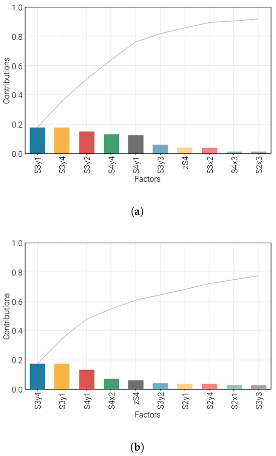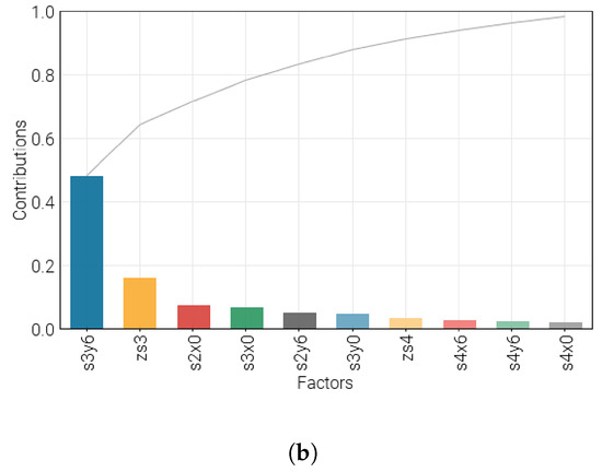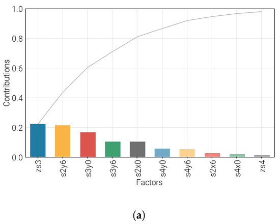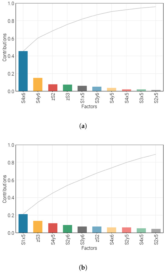 A sensitivity analysis was performed using the smoothing spline ANOVA (SS-ANOVA) in order to understand the influence of the geometric parameters of the deflector on the final particle distributions. The main effect bar charts made it possible to compare the relative importance of the parameters on the objectives and constraints. In Figure 8, only the effect bars for the objectives are reported so as not to overburden the paper. The first ten factors are shown in order of importance.