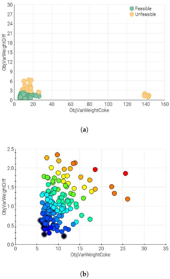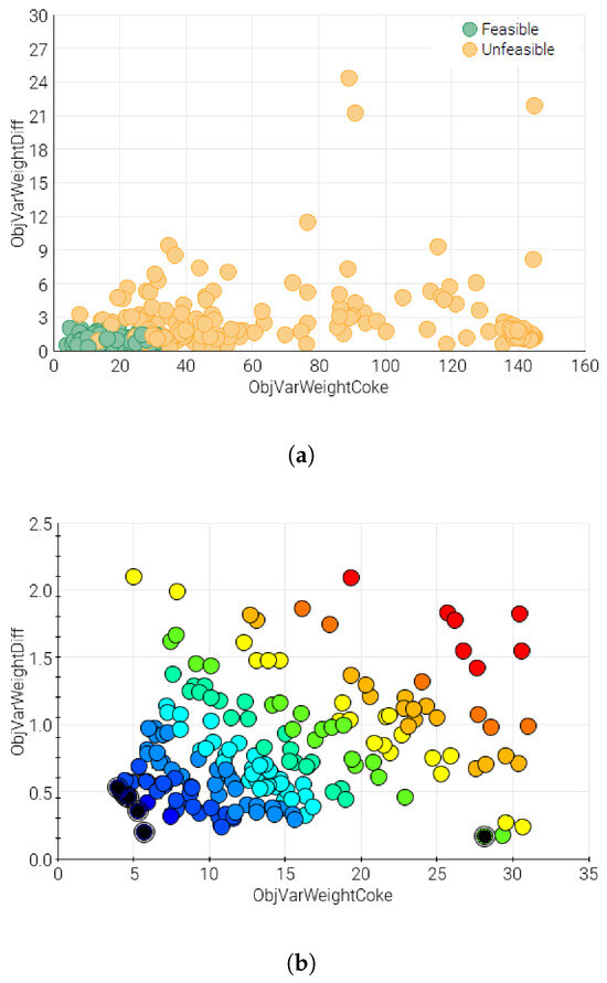 First optimization: (a) real designs on objectives scatter chart; (b) feasible designs on objectives scatter chart with black highlighted Pareto designs, where the color from blue to red indicates the increase in the objective value.