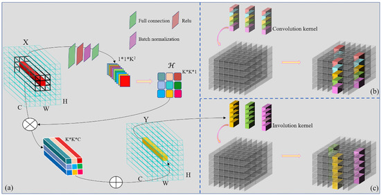 The comparison between convolution and involution. (a) Schematic diagram of involution instance; (b) schematic diagram of convolution; and (c) diagram of involution.