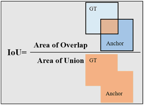 The loss function is used to measure the distance between the prediction tag (anchor) and the real tag. In the Faster R-CNN network, its core part is the RPN network. In order to train the RPN network, the anchor is assigned a binary class tag to judge whether it is an object [23]. We use intersection over union (IoU), that is, the ratio of the intersection area and union area between ground truth and anchor, to indicate the matching degree of the anchor and ground truth (as shown in Figure 3). There are two types of anchors with positive labels [1]: (1) the anchors with the highest IoU overlapping with the ground-truth frame; and (2) the anchors with the IoU overlapping with any ground-truth frame are higher than 0.7. Note that a ground truth can assign positive labels to multiple anchors. In addition, the non-positive anchor locates the negative tag when the IoU value is less than 0.3, and it is discarded when the IoU value is between 0.3 and 0.7. The loss function is calculated by Equation (4).