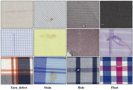 In this paper, a total number of 6308 fabric images, including four common fabric defects, holes, stains, yarn defects, and floats, were collected, which were curated from various sources, including apparel factories, literature references, and the “XueLang Manufacturing AI Challenge”. In order to improve the recognition accuracy and robustness of the model, the dataset was expanded using color conversion and rotation techniques on the original collected images.