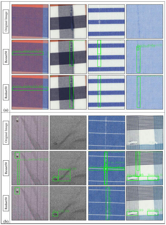 To verify the effectiveness of the proposed method for fabric defect detection, two groups of comparative experiments were conducted in this paper. In the first experiment, the effects of involution and convolution on model performance were discussed, respectively. The primitive Faster R-CNN framework and ResNet50 network were used as a contrast. The experimental results are shown in Table 2. It can be seen from Table 2 that the training parameters and calculation amount of the model were reduced by 24% and 15%, respectively; the APL of large target bounding box was enhanced from 50.5 to 51.1. The result indicates that involution has obvious advantages over convolution in the fabric defect detection performance. Examples of the detection results are shown in Figure 5.