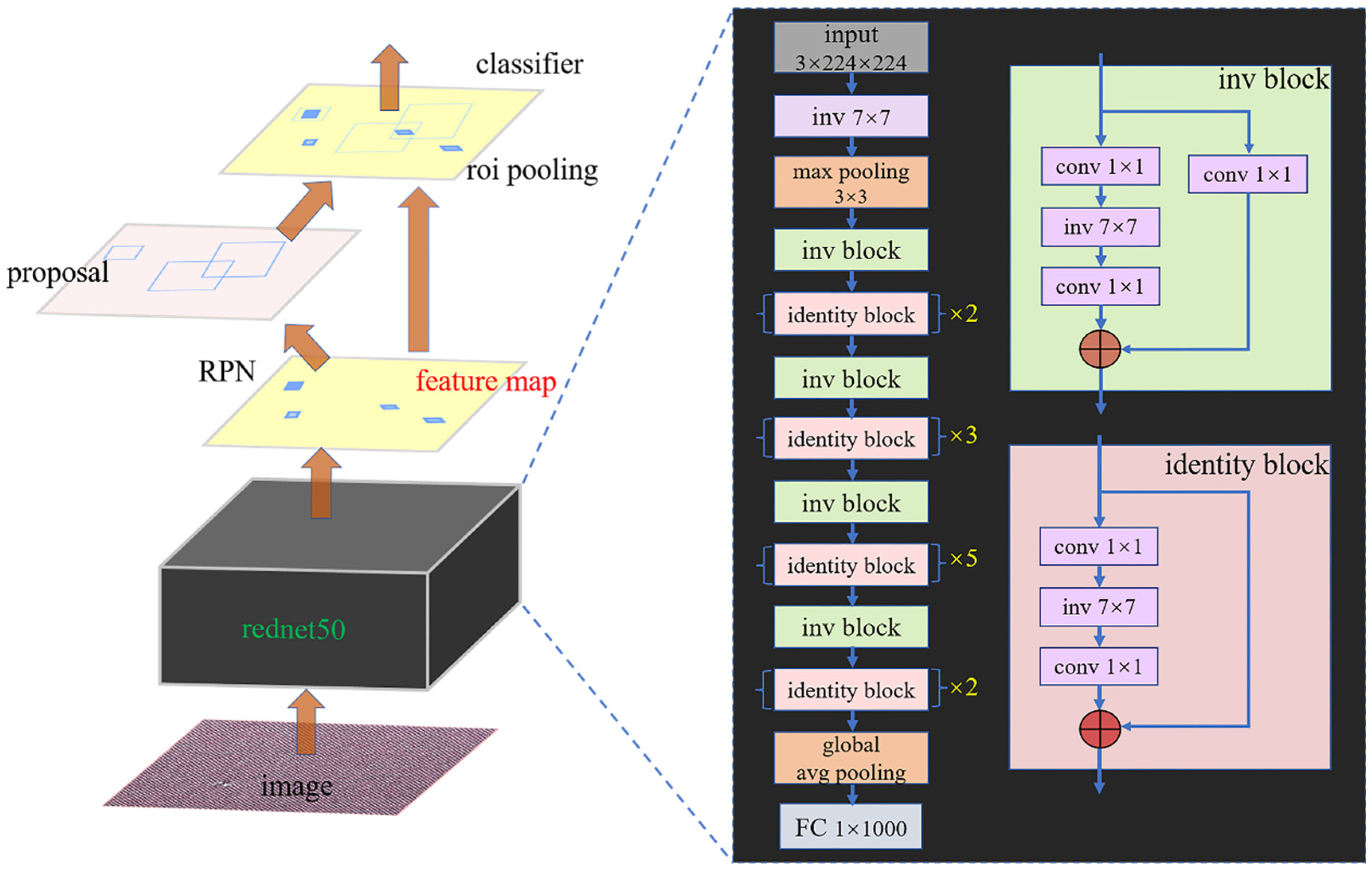Overall network architecture diagram; left: Faster R-CNN network architecture; right: RedNet50 network framework.