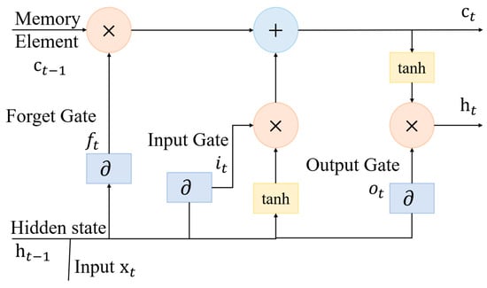 At each time step t, the LSTM processes the current input along with the previous hidden state and cell state . It then updates the cell state and hidden state using the forget, input, and output gates. The forget gate determines which information in should be retained or discarded. The input gate selects new information to incorporate into the cell state and generates a candidate value, ; subsequently, the cell state is updated by combining the outputs of the forget and input gates. Finally, the output gate decides which portions of the updated cell state are passed to the hidden state for use in subsequent layers or time steps.