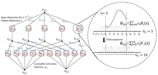 In the “activation layer” of the KAN, multiple B-spline functions with varying numbers of control points are used to approximate functions of arbitrary shapes. Simultaneously, each weight parameter is parameterized as a univariate spline function. As illustrated in Figure 2, the left side shows the activation symbols passing through the KAN network, while the right side displays the activation function parameterized as B-splines, which can toggle between coarse-grained and fine-grained grids []. A spline function is a piecewise polynomial that maintains a high degree of smoothness at the junctions (nodes) where polynomial segments meet. This property enables the KAN network to capture local features and trends in the input data. Each decomposed univariate function is responsible for one dimension or feature of the input, and these functions are combined via addition. This approach simplifies the computation of complex functions and enhances the model’s expressive power.
