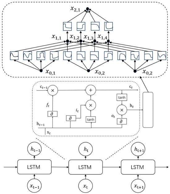 More recently, Liu et al. [] introduced the Kolmogorov-Arnold Network (KAN), a novel architecture that deepens the shallow Kolmogorov network by representing multivariate functions as compositions of univariate functions with desirable approximation characteristics. Chen S et al. [] further improved prediction accuracy by combining LSTM with ensemble learning and convolutional neural networks (CNN), illustrating the benefits of hybrid modeling. However, research combining KAN and LSTM for time series analysis remains limited in the context of pipeline stress prediction, presenting an opportunity to explore their synergistic potential. Unlike Multi-Layer Perceptrons (MLPs) that use fixed activation functions, KANs learn their activation functions during training—often employing B-spline functions for their excellent fitting capabilities and smoothness []. By optimizing these functions, the KAN enhances feature representation and efficient scaling, potentially yielding significant performance improvements over conventional fully connected layers in LSTM.