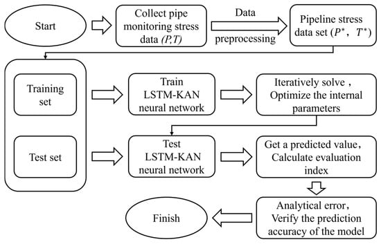 The specific implementation steps are as follows: 1. Data collection: Pipeline stress monitoring data are gathered in chronological order, and Kalman filtering is applied to the raw data. 2. Feature processing: The preprocessed dataset is standardized and normalized. 3. Model construction: The LSTM-KAN model is built by adjusting the training parameters, feature weights, and other variables. 4. Training: The dataset is split, and the LSTM-KAN model is trained to predict the pipeline stress, evaluating the model performance using accuracy metrics. 5. Iteration: Steps 3 and 4 are repeated to fine-tune the model parameters, reduce the loss, and improve the accuracy. Training is stopped when the validation loss reduction in five consecutive parameter adjustments is less than 0.5% and the standard deviation of the prediction error is less than 1%. 6. Comparison: The LSTM-KAN model’s prediction results are compared with those of the traditional LSTM model to assess the model’s performance in predicting the actual pipeline stress values.