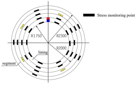 As shown in Figure 5, the pipeline wall is 550 mm thick, comprising a 300 mm-thick precast segment and a 250 mm-thick lining, both constructed of reinforced concrete. To guard against damage to the sensors embedded in the segments and subsequent sensor failure, auxiliary sensors are also installed within the lining. Internal force monitoring is performed using vibratory string sensors. Each circumferential ring includes 30 monitoring points, which are distributed circumferentially on the inner and outer reinforcements of the top, bottom, and sides of each lining ring. These points are located on the inner and outer reinforcements at the center of each segment, at positions corresponding to the lining monitoring points, and along the segment joints. At each cross-section, the strain gauges from 30 monitoring points are connected to a single data acquisition instrument and conversion module. A single data cable per cross-section extends to a buried junction box that houses a 64-channel data acquisition instrument. The 30 strain gauge signals are converted into 485/232 digital signals and transmitted via a network cable or optoelectronic conversion to an external data acquisition box at the inlet, which is then relayed via 4G/5G wireless transmission to a system data server or cloud server.