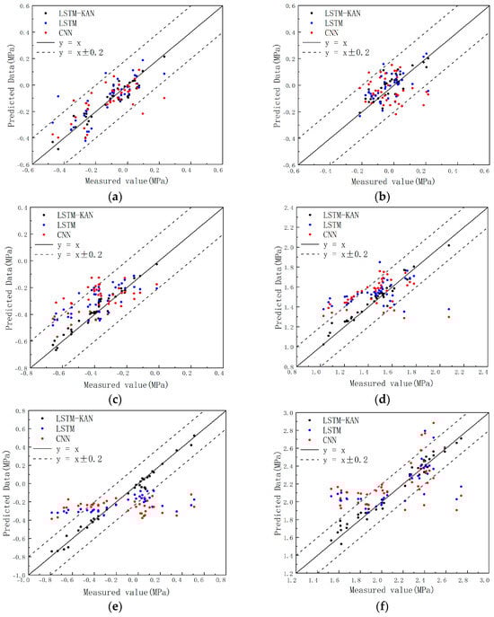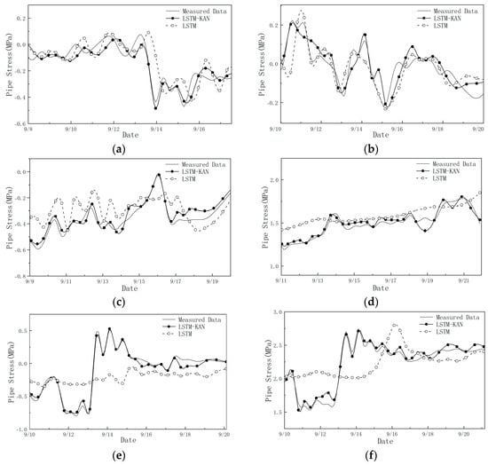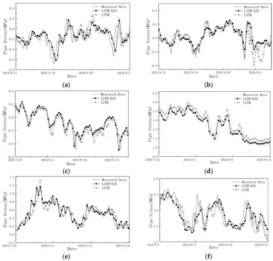 Figure 8 shows the training results of the two model types for stress prediction at the six monitoring points using the training dataset. Figure 8a–f corresponds to the six distinct monitoring points, and to facilitate a clearer comparison of the models’ curves, approximately 20 days of data for each point are displayed. The results clearly indicate that whether stress exhibits continuous fluctuations or abrupt changes, the predicted trends largely mirror the actual measurements. This observation confirms that both the LSTM and LSTM-KAN models effectively capture the temporal dependencies and dynamic characteristics inherent in the deformation processes of sewage pipelines. Notably, the close alignment of the predicted trends with the observed data during training suggests that the models have internalized the complex relationships between the input features and stress variations, which is critical for reliable performance on unseen test datasets [,].