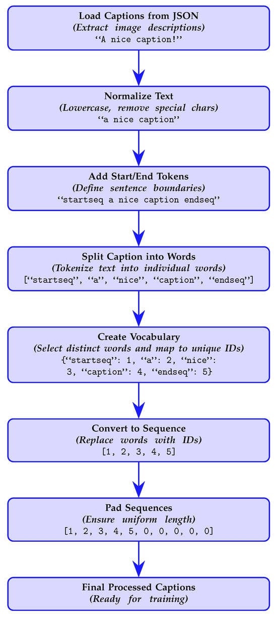 We utilized the Keras Tokenizer from tensorflow.keras.preprocessing.text to transform raw captions into structured numerical inputs.