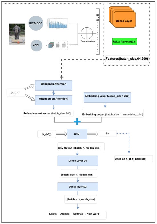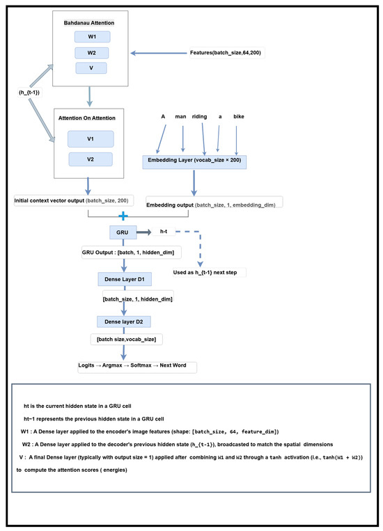 Decoder architecture for image caption generation. The decoder integrates a pre-trained embedding layer, Bahdanau attention followed by Attention-on-Attention (AoA), a GRU unit, and two dense layers. At each decoding step, the context vector is computed by applying Bahdanau attention over the image features using the decoder’s previous hidden state . This context vector is then refined by the AoA module and concatenated with the embedding of the current input word. The resulting representation is passed to the GRU, which outputs an updated hidden state . This hidden state is subsequently processed by two dense layers to produce a probability distribution over the vocabulary, enabling the prediction of the next word.