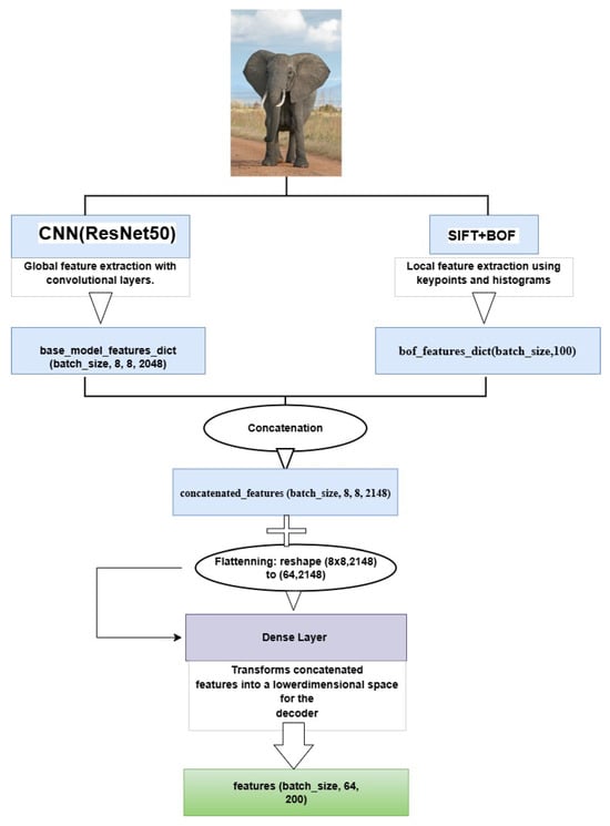 The encoder architecture, illustrated in Figure 4, is implemented using TensorFlow Keras’s subclassing API by extending the Model base class. This approach offers flexibility and facilitates integration within the TensorFlow ecosystem. The encoder is designed to merge deep and handcrafted visual features and transform them into a compact and expressive representation for subsequent processing by the decoder.