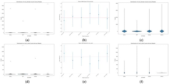 These moderate-to-large effect sizes validate that model architecture exerts a substantive influence on gender output distributions, addressing the reviewer’s request for formal inferential testing. Subsequent Tukey’s HSD post hoc analyses (family-wise ) further resolve these omnibus effects into pairwise contrasts: no two models differ significantly in their mean counts of “female” or “male” assignments (all 95% confidential intervals (CIs) for mean differences straddle zero), but the “non-binary” class exhibits two highly significant contrasts. Specifically, Claude 3.5 Sonnet exceeds GPT-4o by 9.8 persona assignments on average (95% CI [1.2, 18.4], ), and GPT-4o falls behind Gemini 1.5 Pro by 10.2 assignments (95% CI [–18.9, –1.5], ). Figure 2 shows the combined box/violin panels reveal broadly comparable female and male mention distributions across Llama, GPT, Claude and Gemini—with only scattered high outliers—and very sparse “other”-gender counts overall. Tukey’s HSD tests corroborate the absence of significant pairwise differences in female, male or “other” categories, yet identify GPT as the sole model that produces a significantly higher incidence of non-binary references than its peers. No significant model pair differs in the “other” category, reinforcing its uniformly minimal representation across architectures, hinting at a subtle architectural bias in token representations [33,34].