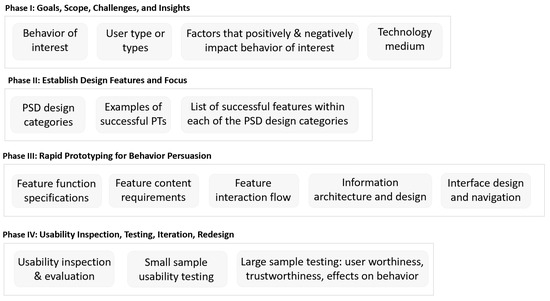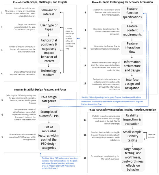 The initial phase focuses on defining broad behavior change goals. This involves conducting extensive literature reviews, technology scans, and needs assessments (e.g., including an analysis of the context within which the app will be used) to identify gaps in existing apps, their functions, and technology features. Leveraging Fogg’s PSD principles [21], this phase aims to identify and select behaviors that are important, specific, measurable, and achievable, refining broad goals into actionable objectives. This systematic approach is a new one, providing standardized procedures that have been missing in prior versions of PSD. This new approach offers techniques for evaluating persuasive technologies to ensure that selected behaviors are relevant and effectively addressed within the system’s design. Once key behaviors and persuasive requirements are mapped, the process moves to feature selection, ensuring that persuasive strategies align with user needs.