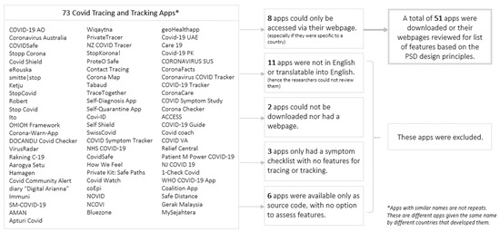 To improve the quality and accessibility of the review, specific inclusion and exclusion criteria were applied. Apps were excluded if they were not accessible in the U.S. due to geographic restrictions, could not be downloaded or installed, lacked English-language support, or required payment or subscription, as this would limit public accessibility during a time of widespread health crisis. After applying these criteria, a total of 51 apps remained and were reviewed. Each was either downloaded or, where applicable, accessed via a web-based platform to evaluate the extent to which its features reflected PSD principles. Selection was not based strictly on popularity or user adoption metrics, but rather on ensuring accessibility and diversity of function across global and national COVID-19 responses. The selection, inclusion and exclusion process of the 51 apps that were reviewed is shown in Figure 3.