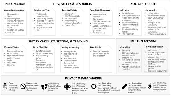 - Osmanlliu, E.; Rafie, E.; Bédard, S.; Paquette, J.; Gore, G.; Pomey, M.P. Considerations for the design and implementation of COVID-19 contact tracing apps: Scoping review. JMIR mHealth uHealth 2021, 9, e27102. [Google Scholar] [CrossRef]