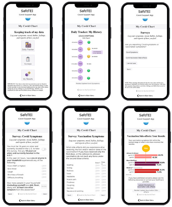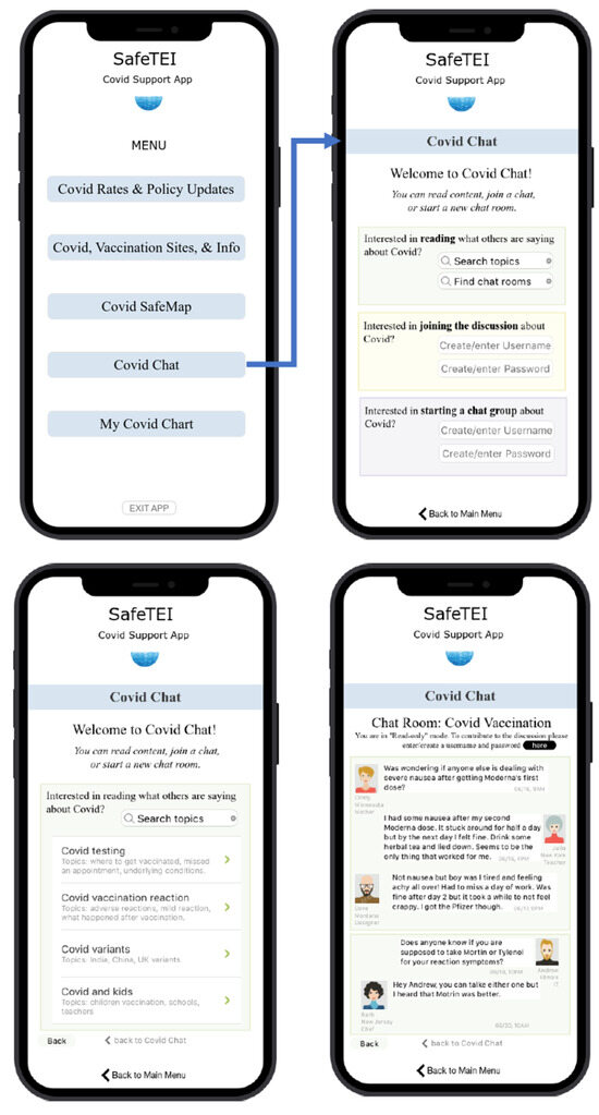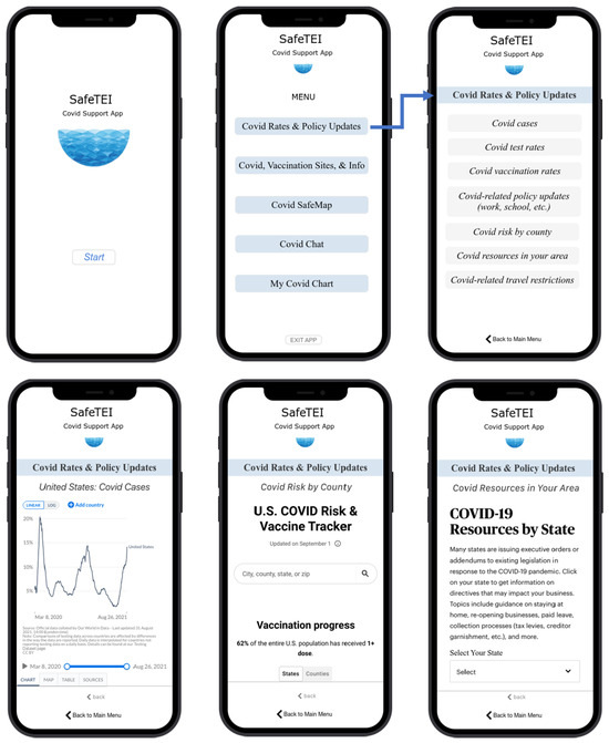 After analyzing the shared needs and goals across the general population and user types with unique needs; the design team identified core needs that included information on COVID rates and policy changes, vaccination updates and variants, safe locations in their area, a platform for community members to connect and exchange information about COVID, and a place to store personal COVID-related information. These needs can be transformed into functions and features of the app in the subsequent stages of R-PSD. Each of the needs can also be broken down into specific tasks that a user would perform using the app, such as finding COVID-related travel restrictions for an upcoming trip, locating a nearby booster shot site, or finding an online chat forum for COVID discussion and sharing tips. The technology medium selected for SafeTEI was a smartphone.