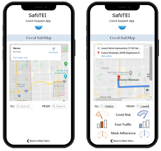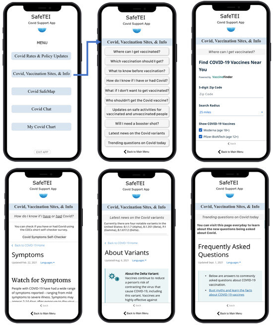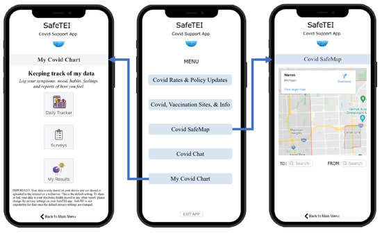 The results from the small-sample usability testing were used to conduct the next round of design iterations on the SafeTEI prototype. Some of the main feedback from users were related to the amount of information displayed within the app. While the breadth and depth of information was considered useful to have within a single app, users felt that this also made it challenging to navigate. This was reflected in the SUS results, where users rated the app’s perceived usefulness as generally high, but low screen satisfaction and usability (Table 7). To address this concern, the research team redesigned the menu bar and the ‘information’ and ‘tips, safety, and resources’ levels into tiles, and simplified the labels and content of sub-menu such as ‘Where can I get vaccinated?’ into ‘Vaccination Sites’. The interactive charts were intended to provide users a way to explore COVID rates at the country, state, county, and regional level. But such charts were found to be informationally dense. Hence the research team redesigned these features by replacing charts with single numbers. Lastly, users found the COVID SafeMap to be a helpful and novel mapping tool, but suggested that the icons used to depict ‘Foot Traffic’, ‘COVID Risk’, and ‘Mask Adherence’ be revised to be more intuitive and easier to read. The research team reviewed examples from different mapping tools to improve the design and display of the COVID SafeMap.