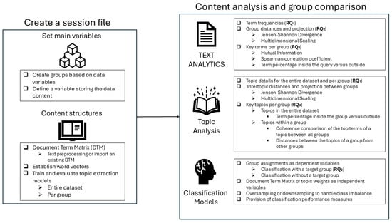 https://skillab-project.eu/ (accessed on 17 February 2025)) is utilized. This tool offers functionalities for conducting content analysis and group comparisons via data importing, topic extraction, statistical analysis, and machine learning.