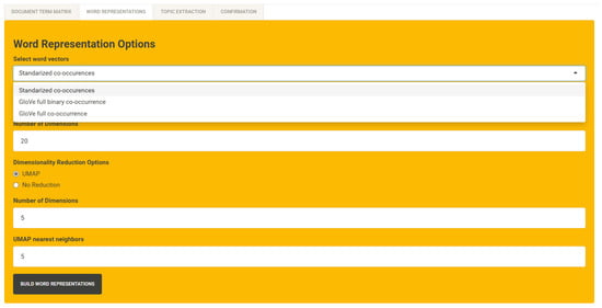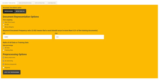 At this point, it is worth providing an inclusive summary of the steps and settings that were followed to create all the necessary data structures, i.e., DTM, TCM, word vectors, and topic models, for creating the session file used in the following experiments. These steps are also discussed in