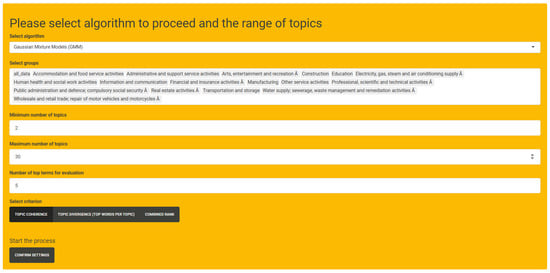 Section 3.1). First, the former file was imported to create 17 distinct groups, 1 per sector. Next, instead of proceeding to text preprocessing pipelines for creating a DTM, the second file was imported, which also constitutes a DTM with binary weighting. Furthermore, to establish word vectors, the skill co-occurrences were imported to the UMAP algorithm to project the skills in a new vector space with five dimensions. These skill vectors constituted the inputs to the GMM algorithm, where 29 different models were trained in the range from 2 to 30 topics/clusters to find the optimal one. To evaluate the models, the topic coherence approach in the tool was followed, i.e., NPMI. The later analysis constitutes the final step for creating a session file, as all data structures required for content analysis and group comparison (