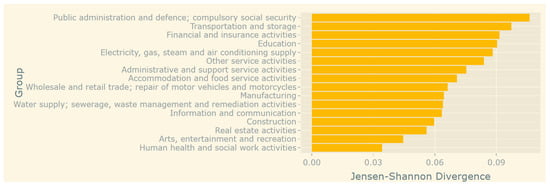 Professional, scientific and technical activities sector and the rest. Overall, the utilized measure ranges from 0 to 1, where values closer to 1 indicate total independency, while values closer to 0 indicate identical probability distributions, i.e., similar sectors/groups. The figure shows that the minimum divergence is higher than 0.03, while the rest of the sectors were associated with at least one lower evaluation. It should be mentioned that when considering all skills, not only the digital ones, the
