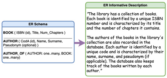 LLMs also have the potential to serve as a powerful tool for automating the generation of natural language descriptions of ER schemas, improving the comprehensibility of database structures and information represented in the schema itself. They can provide detailed explanations of the schema, including the relationships between entities and their properties. As an example, Figure 1 shows the portion of an initial ER schema for a database about a library loan system and the informative description corresponding to the ER obtained by employing an LLM. The text demonstrates how an LLM can understand the properties beyond the two entities (BOOK and AUTHOR) and the binary relationship linking them (AUTHOR_OF), and transform a structured schema into an accurate description. The obtained text is intuitively helpful for communication with expert and non-expert users without the need to interpret (complex) ER schemas. By facilitating the deeper understanding of the database design, it serves as documentation useful for knowledge transfer, reference, and future updates. It also supports the validation of the schema to ensure that the requirements of the system are met.