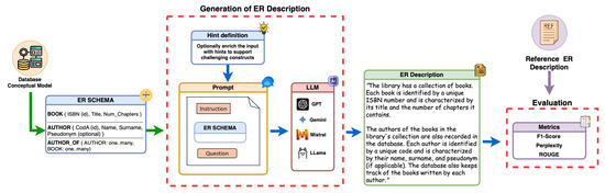 Figure 2 illustrates our proposed framework for transforming an entity-relationship (ER) schema into a descriptive human-readable text using different LLMs. The process consists of different steps: