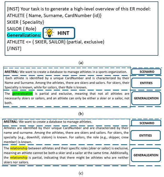 Figure 4c shows the description provided by the LLM when the hint is omitted. The critical point is that the ER construct is incorrectly referred to as “relationship” holding “between athletes and their specific roles (skiers or sailor)”. This description seems to suggest that the concepts of athlete, skier, and sailor are perceived as three separate and independent concepts, whereas the ER model indicates the presence of only one concept (athlete) of which the other two are specializations.