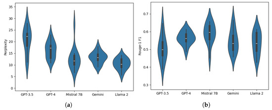 Violin plot reporting the results in terms of (a) perplexity and (b) ROUGE-1 F1 score.