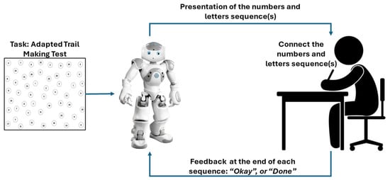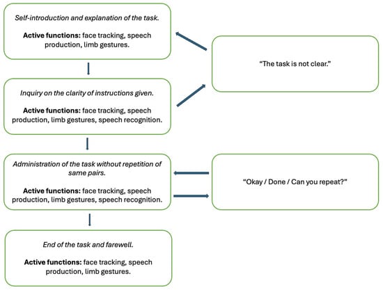 As a supportive agent, the NAO 6 humanoid robot (United Robotics Group, Santa Monica, CA 90404, USA) was used. The reason for this choice is that it is a commercially available platform meeting our key requirements, including the ability to speak, listen, and engage in social interactions. Additionally, NAO was recognized as a social robot that tends to be well-received by older and vulnerable adults, as highlighted in prior research [14]. It is a 58 cm high social robot designed to interact with different interfaces, such as speech production, speech recognition, and limb gestures. It was programmed with Choregraphe software (version 2.8.7) and Python code to interact and collaborate with participants in three out of the four conditions of the study. Specifically, the robot’s behavior was structured through block-based visual programming with a node flow interface. The robot started with tracking the face of the participant and mimicking eye-contact, introducing itself, and giving the first instructions. The speech recognition function was also activated, so that the robot could repeat the initial explanations upon request. The first part of the interaction was meant as a vocal trial that varied according to human feedback. However, after that initial warm-up, the NAO did not repeat its instructions so as not to interfere with the cognitive task, but the listening function was continuously activated to regulate the pace and turn-taking of the interactions. The NAO moved on with the task when the participant stated “Okay”, or “Done”. Please refer to Figure 3 for additional information on the flowchart of interaction.