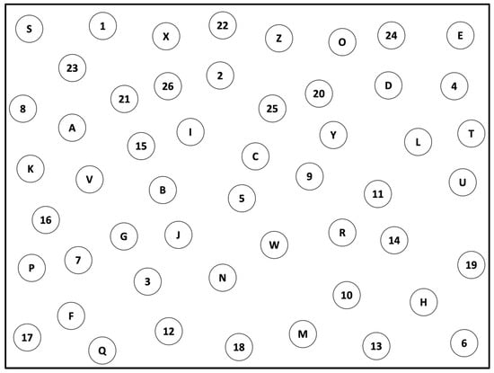 The cognitive task was inspired by the B form of Trail Making Test (TMT) [29]. TMT was chosen over other cognitive measures because it stresses several mental abilities, like attention, visual search, executive functions, and working memory. Therefore, it subjects the participant to a trial in which they use multiple skills simultaneously, resembling most daily activities. Our task, in particular, consisted of a 29.7 × 42 cm paper sheet displaying 52 circles spread out randomly. Half of the circles contained English letters from A to Z, while the other half showed numbers from 1 to 26 (Figure 2). Overall, four parallel forms (i.e., with different random dispositions of circles) of the same task were prepared for all participants, each corresponding to one of the four conditions of the study. Resulting objective performance parameters were number of correct/incorrect pairs joined, and time of execution.