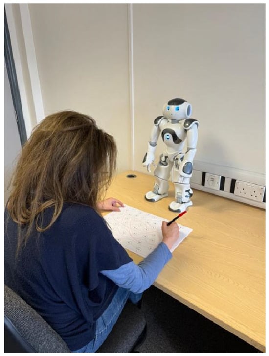 Therefore, we conducted the current study with adults to preliminarily verify whether and how a supportive human–robot interaction (HRI) could impact on the performance and the perceived effort due a complex activity, while the same cognitive skills required for daily autonomy were increasingly elicited. Specifically, participants completed a cognitive task at three different levels of CL, while supported by a SAR (Figure 1). Number of errors, time of completion, and perceived fatigue were measured for rating the performance and the effectiveness of support. As an important addition, we also included a baseline where the task was executed without the support of SAR. Our overall goal was to understand under which conditions an external robotic support could be helpful for outcome improvement and mental demand management, hypothesizing that SAR are beneficial when compared to not assisted tasks, but only when user’s cognitive features are taken into account for a tailored interaction. Therefore, considering the lack of studies involving SAR in a similar framework, we explored how this technology can help independent living, and how this support impacts objective and subjective measures of CL.