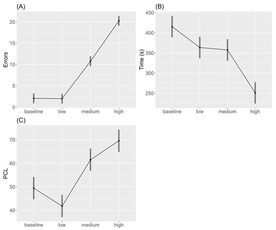Means (M) and standard deviations (SD) of errors, time, and PCL across the four conditions are displayed in Table 1.