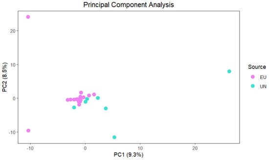 Figure 1 represents a PCA of the retrieved Instagram posts conducted in R 4.4.3. PCA can help uncover the trends and the overlaps in social media communication. In our case, PC1 and PC2 amount to 17.8% of the total variation in the dataset. Most of the posts (in both EU and UN groups) are closely clustered, expectedly indicating that they share similar thematic elements. However, a few outliers, especially among the UN group posts, are more widely spread along PC1 and PC2; this configuration may reflect more diverse topics covered.