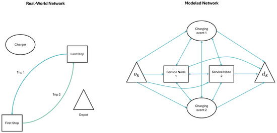 To provide an example, the translation of a real-world network with two trips, a depot, and a charging station is presented in Figure 1. In the modeled network, the depot is represented by two nodes: and . The two trips are represented by the two service nodes, and the charger can offer two charging events, depicted as two different nodes in the modeled network.