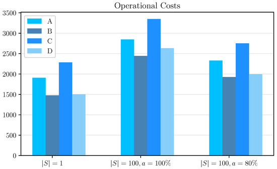 The box plots of the operational costs simulations are presented below in Figure 5, Figure 6, Figure 7, Figure 8, Figure 9, Figure 10, Figure 11 and Figure 12. In each case, the box is defined as the inter-quartile range (IQR) of the corresponding sample, while the whiskers extend to the values that have a IQR difference from the median. The median is shown as a black line that intersects the box and the outlier values are shown as diamond-shaped points.