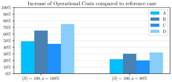 Graphic representation of percentage increase in operational costs compared to reference case by scheduling case and evaluation method.