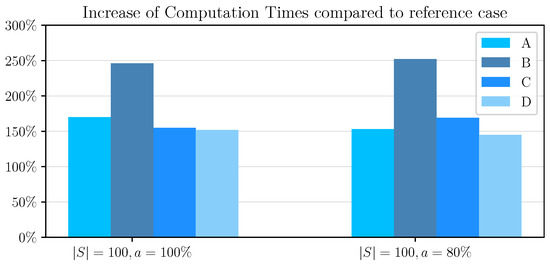 As presented in Table 7, when solving the stochastic optimization problem considering travel time outcomes, computation times are approximately 150 to 250 times greater than the corresponding computation times for solving the deterministic model (). The use of the chance constraint does not significantly change the computation times compared to the case of not using the chance constraint, as we can also observe in Figure 4.