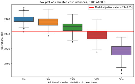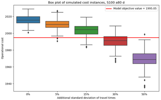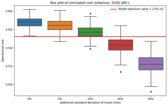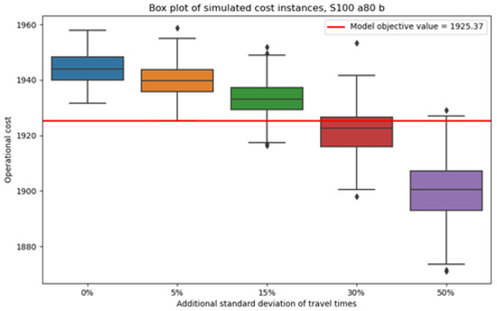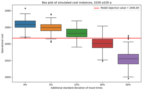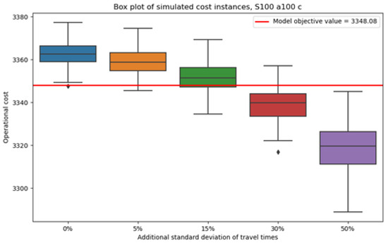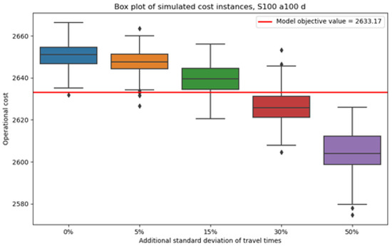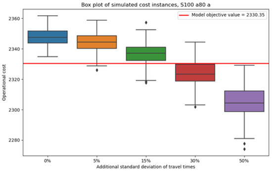 In each simulation, 100 travel time outcomes are computed for each service node. The mean values of the normal distribution of the natural logarithms of the travel times are equal to those of the numerical experiment, while the standard deviations receive their respective increase. The seed value is random for each simulation. The values of the parameters , , are identical to those of the numerical experiment, while for the parameters , and , the values of the corresponding decision variables are used from the evaluation results of the relevant schedule.