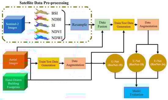The conceptual model of the research is shown in Figure 1. Initially, the necessary data, including Sentinel-2 satellite images, aerial images, and available building footprint information, are collected. In the satellite data preprocessing section, the required indices are extracted from the satellite image, and then resampling is performed on these indices to match the spatial resolution of the aerial images. Two training datasets are then created: one comprising only aerial images and the other consisting of both aerial images and satellite indices. Finally, three different U-Net models, utilizing ResNet-18 and ResNet-34 backbones, are trained using these datasets. The performance of these models is compared to determining the best one.