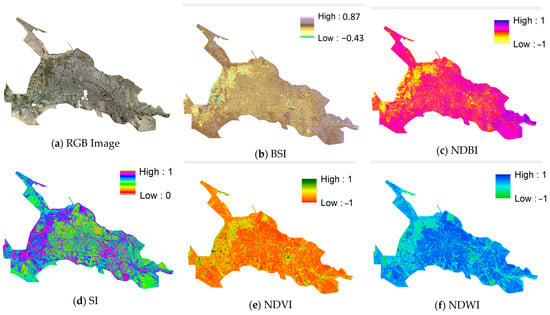 The RGB image and various indices for the city of Tabriz. (a) RGB image, (b) BSI, (c) NDBI, (d) SI, (e) NDVI, and (f) NDWI.