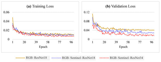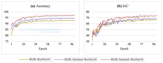 The results of training loss and validation loss for the models are displayed in Figure 6. The x-axis represents the epochs. Analyzing the training loss of all three models reveals that none of them overfitted the data. However, when analyzing the validation loss, it is evident that the RGB–Sentinel–ResNet34 model consistently had the lowest validation loss from the beginning. It demonstrated a more stable decrease throughout the training process, ultimately reaching a final validation loss of 0.0162. The RGB–Sentinel–ResNet18 model performed slightly worse, with a final validation loss of 0.0277. The RGB–ResNet18 model had the poorest performance among the three, achieving a final value of 0.0400. Overall, the RGB–Sentinel–ResNet34 model outperformed the others in reducing validation loss, demonstrating its superior performance. Furthermore, an analysis of the IoU and accuracy values (Figure 7) confirms that the RGB–Sentinel–ResNet34 model outperforms the other two models.
