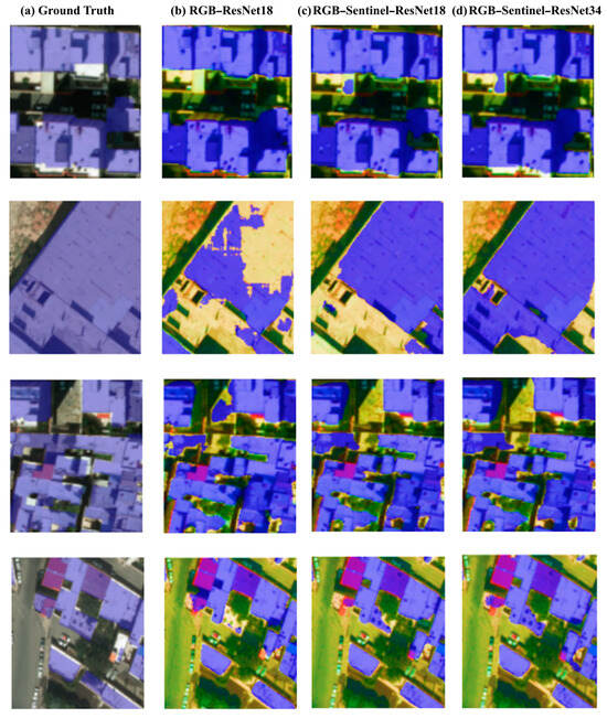 The output results of different models: (a) Ground Truth, (b) RGB–ResNet18 model output, (c) RGB–Sentinel–ResNet18 model output, (d) RGB–Sentinel–ResNet34 model output.