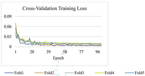 The cross-validation training loss (Figure 9) across all five folds exhibits a consistent and sharp decrease within the first 10–15 epochs. This indicates that the model rapidly learns to minimize error early in training. As training progresses, the curves flatten and converge, suggesting stability in learning and absence of major overfitting signs within the training domain.