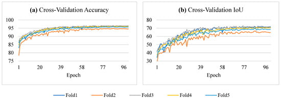 (a) Cross-validation accuracy and (b) cross-validation IoU for different folds.