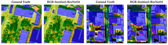 The RGB–Sentinel–ResNet34 model has achieved the best results for both the building footprint and background classes due to its more advanced architecture and the use of Sentinel data (Figure 8).