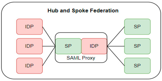 Several architectural patterns are often used in the context of identity systems, especially in identity federations, in which various institutions must share information about their users. As a model that helps to facilitate interactions between institutions, the hub and spoke model can be used. This model contains a central hub, which acts as an intermediary between the participants (speakers) [1]. Users connect to a central point, which then manages requests for authentication or other services. In this model, all service providers (SPs) and identity providers (IdPs) connect to an SAML proxy, which is a central node that acts as an intermediary between these SPs and IdPs.