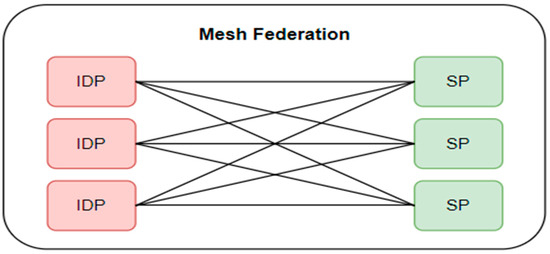 In the mesh architecture, each SP is (potentially) connected to each IdP, where the SP is the service or application that seeks to verify the identity of users to allow them access, while the IdP is the entity that verifies the identity of the users and provides their credentials (e.g., an institution that manages user logins).