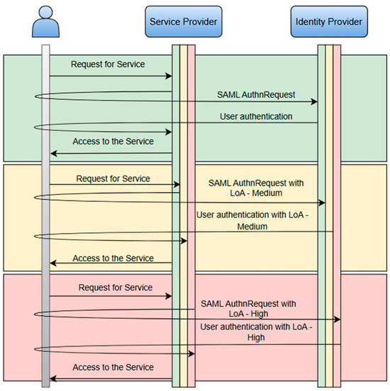 Level of assurance (LoA) profiles represent a set of rules that define the level of security and trustworthiness in the process of authenticating user identities in federated systems [17]. LoA profiles are used to assess how trustworthy a verified identity is, representing the complexity of processes used for its protection and authentication. In the identity federation context, LoAs are defined as protocols/procedures for establishing user identity and methods for the authentication of electronic identities, ensuring a uniform level of security for electronic services and transactions [18].